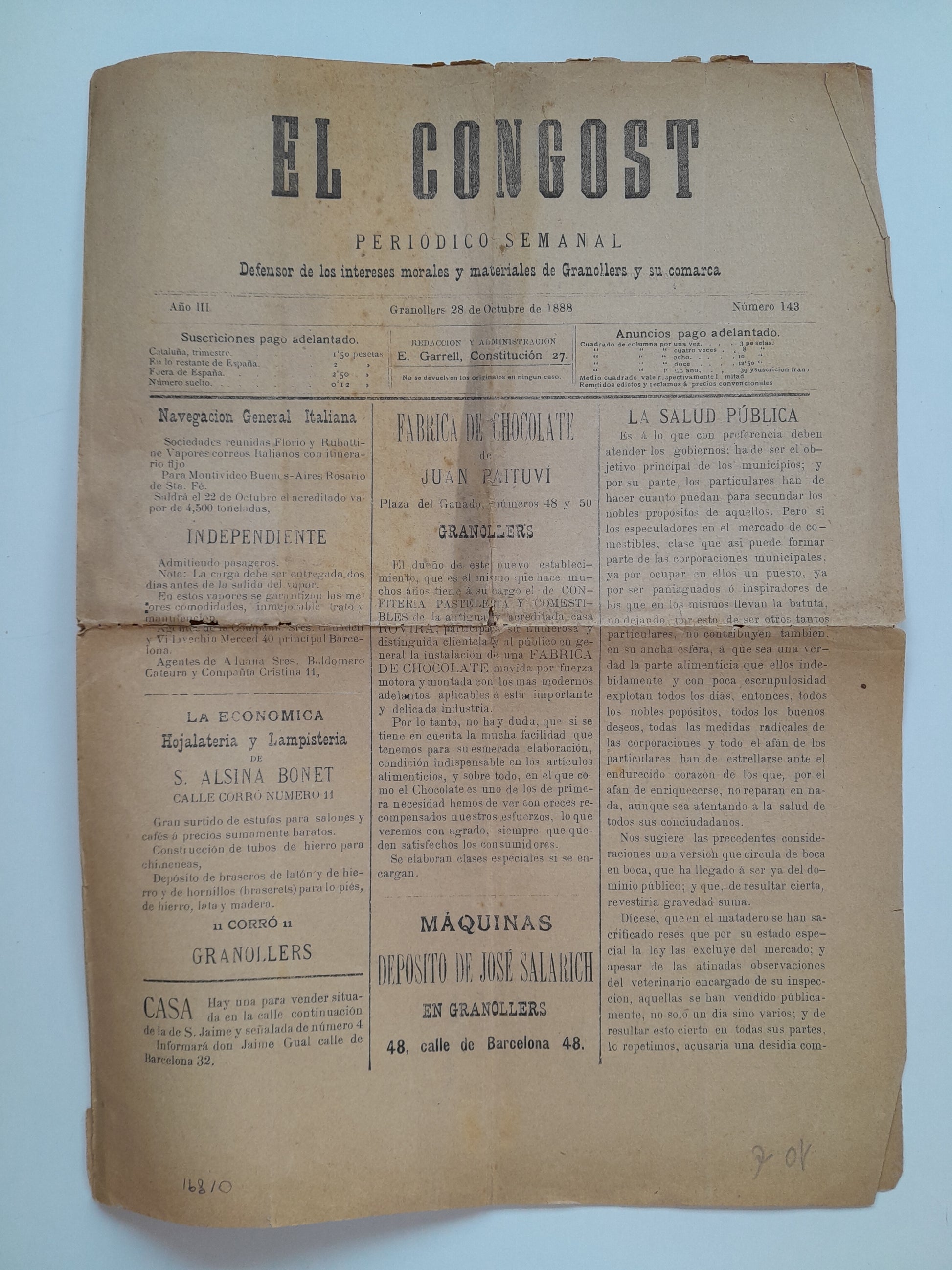 EL CONGOST (GRANOLLERS) - ANY 3, NÚM. 143 (28 OCTUBRE 1888)